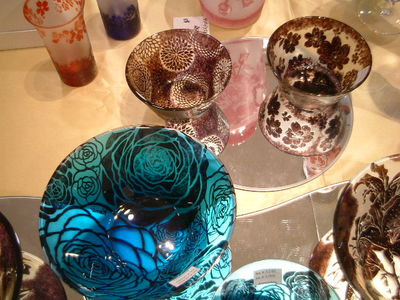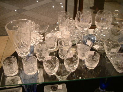 金剛砂を圧縮空気で吹き付けて彫刻します。透明や被せガラスに彫刻します。